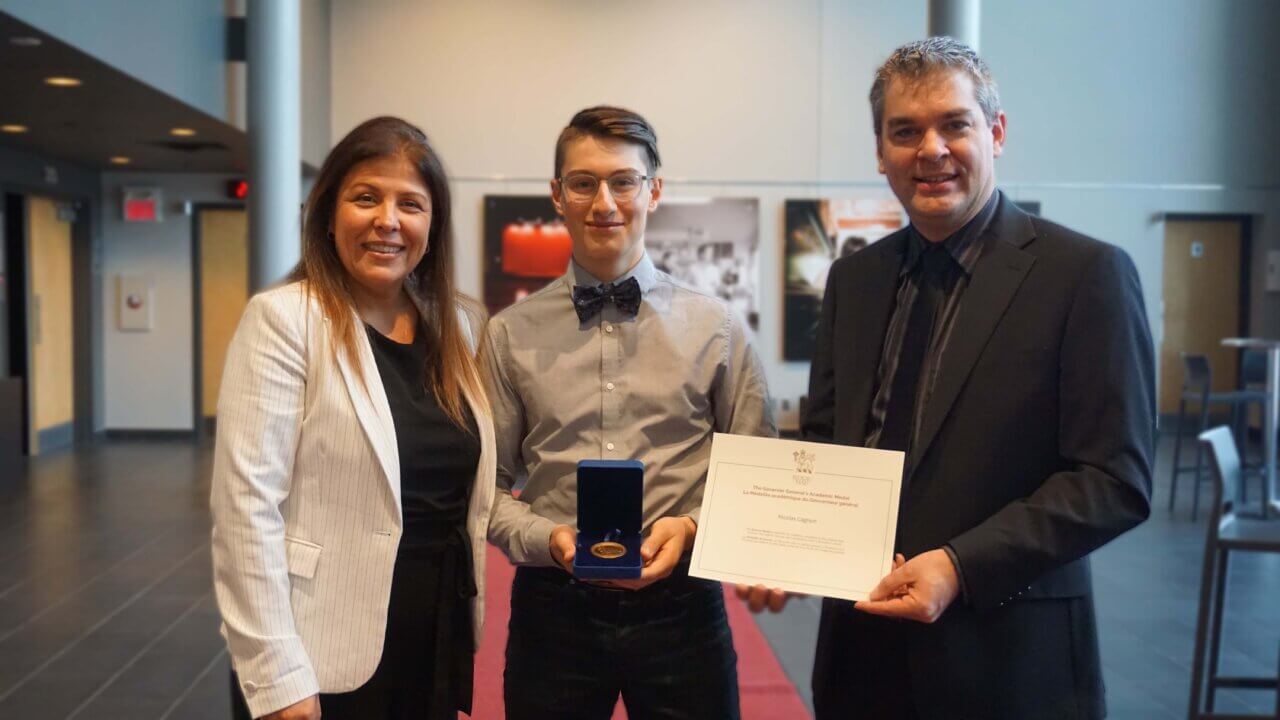 Nous sommes extrêmement fiers de souligner le parcours remarquable de Nicolas Gagnon, élève de la promotion 2025, qui s’est distingué par une moyenne générale impressionnante. Aujourd’hui, il reçoit la médaille du Gouverneur général du Canada, une reconnaissance prestigieuse qui témoigne de son engagement et de son excellence académique.